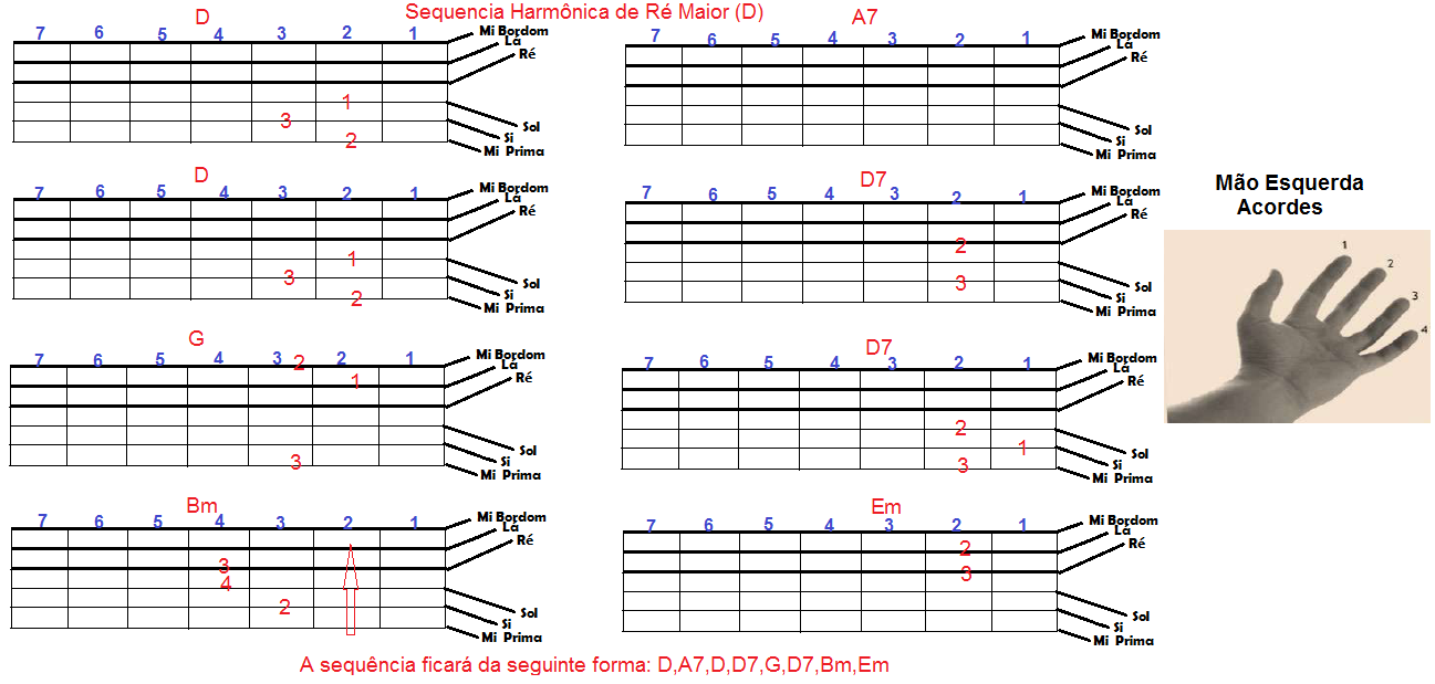 Os dedos também são enumerados como você percebe na figura que está ao lado da grade da Sequência Harmônica de Ré Maior. A mão usada para fazer os acordes são os dedos da mão esquerda.